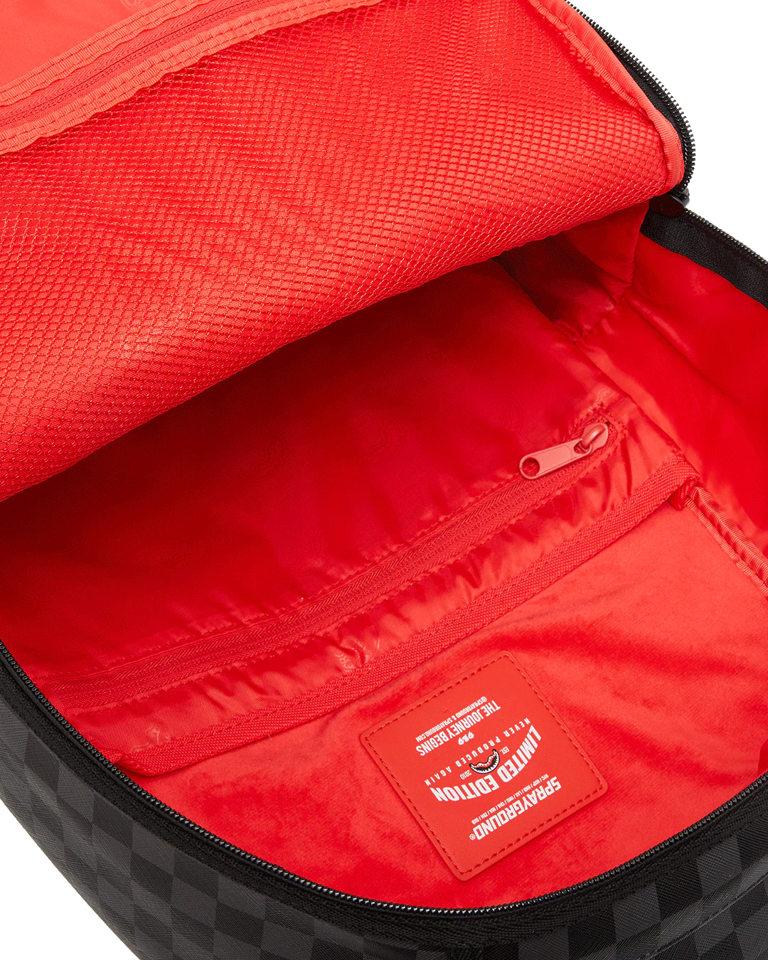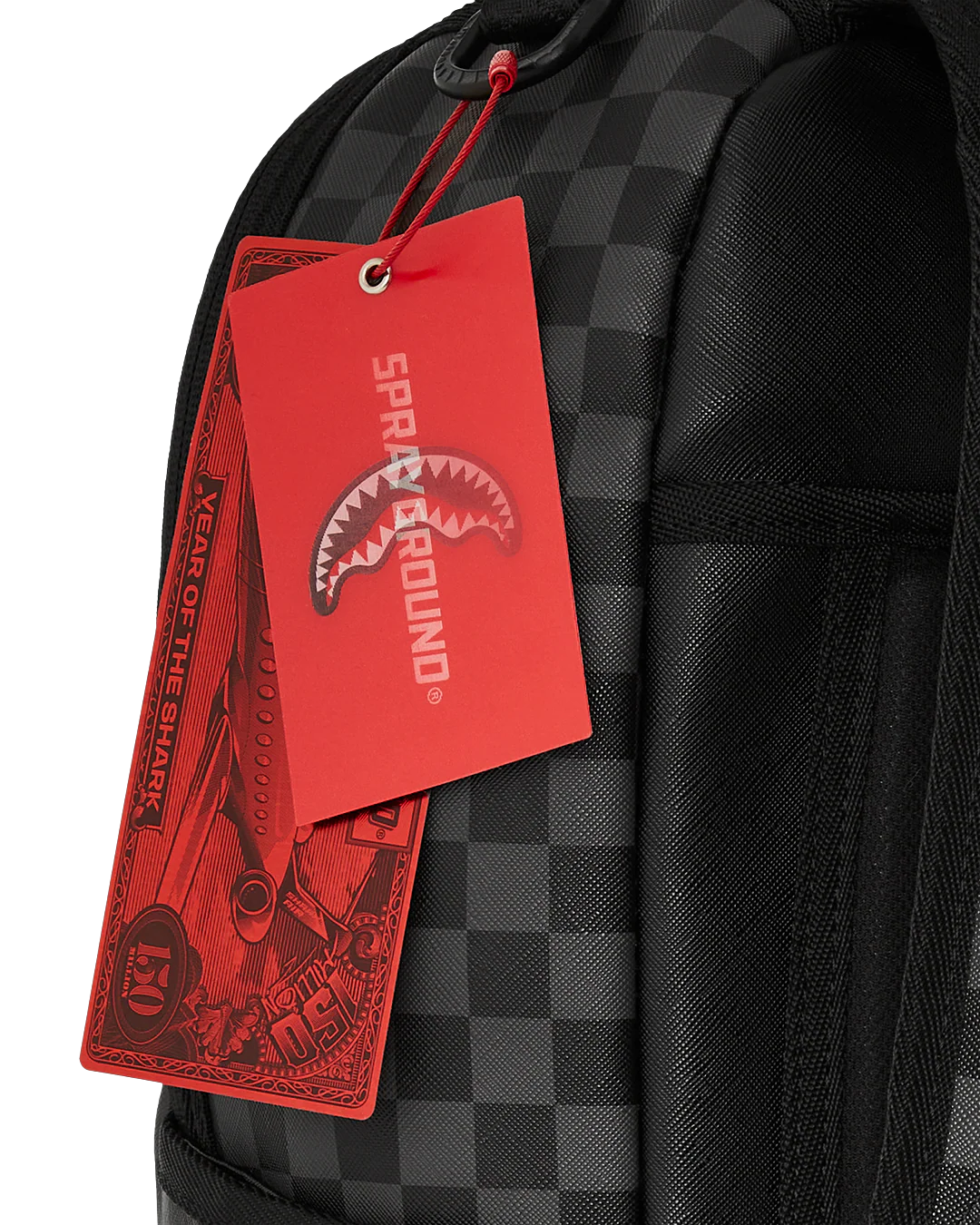 - Dimensions: 18" x 6" x 11.5" • Front zipper pocket • Side pockets • Zippered Stash pocket • Separate velour sunglass compartment • Ergonomic mesh back padding • Adjustable Straps for custom sizing • Gold zippers with metal hardware • Metal "Sprayground Authentic" badge • Slide through back sleeve connects to carry-on luggage to free your hands