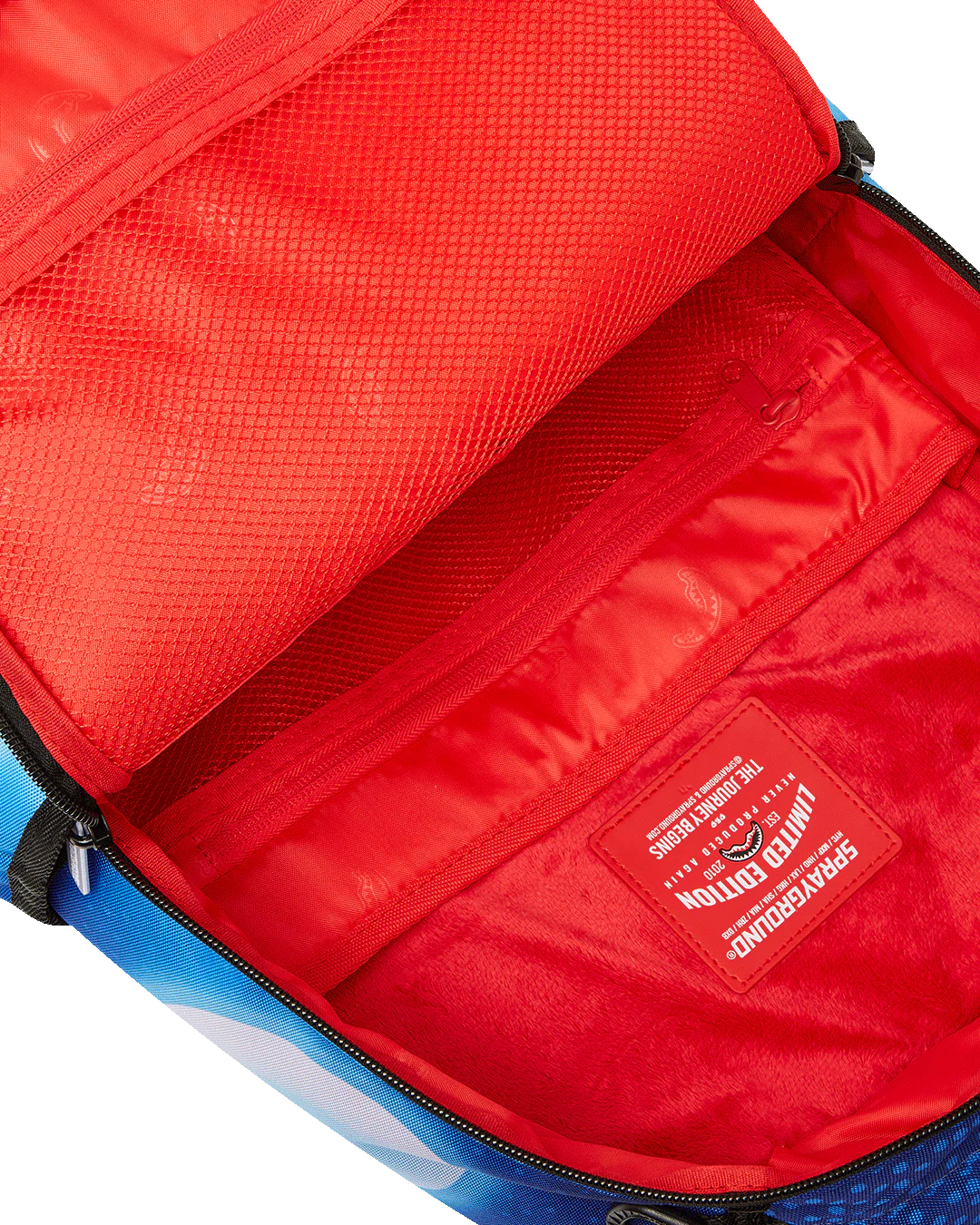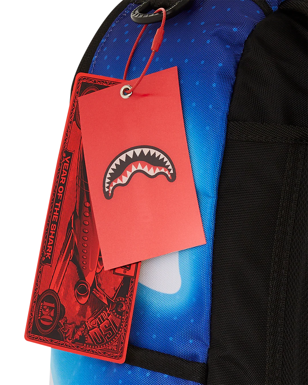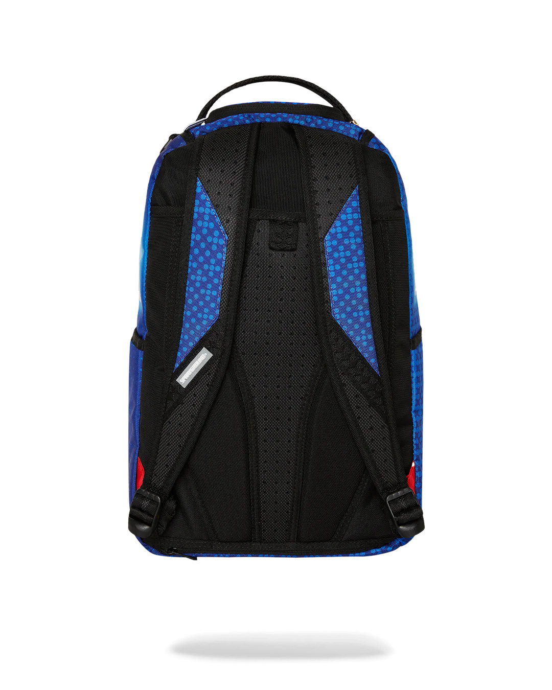 - Dimensions: 18" x 6" x 11.5" • Front zipper pocket • Side pockets • Zippered Stash pocket • Separate velour sunglass compartment • Ergonomic mesh back padding • Adjustable Straps for custom sizing • Gold zippers with metal hardware • Metal "Sprayground Authentic" badge • Slide through back sleeve connects to carry-on luggage to free your hands
