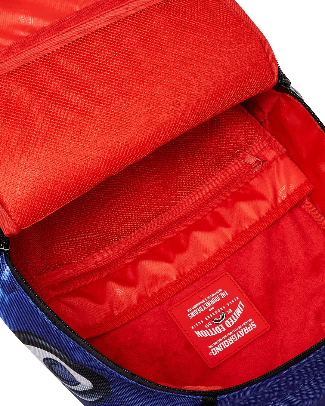 - Dimensions: 18" x 6" x 11.5" • Front zipper pocket • Side pockets • Zippered Stash pocket • Separate velour sunglass compartment • Ergonomic mesh back padding • Adjustable Straps for custom sizing • Gold zippers with metal hardware • Metal "Sprayground Authentic" badge • Slide through back sleeve connects to carry-on luggage to free your hands