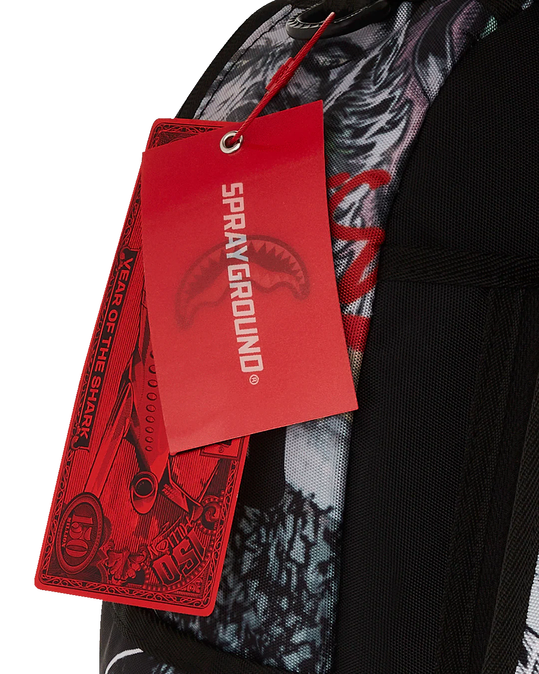- Dimensions: 18" x 6" x 11.5" • Front zipper pocket • Side pockets • Zippered Stash pocket • Separate velour sunglass compartment • Ergonomic mesh back padding • Adjustable Straps for custom sizing • Gold zippers with metal hardware • Metal "Sprayground Authentic" badge • Slide through back sleeve connects to carry-on luggage to free your hands