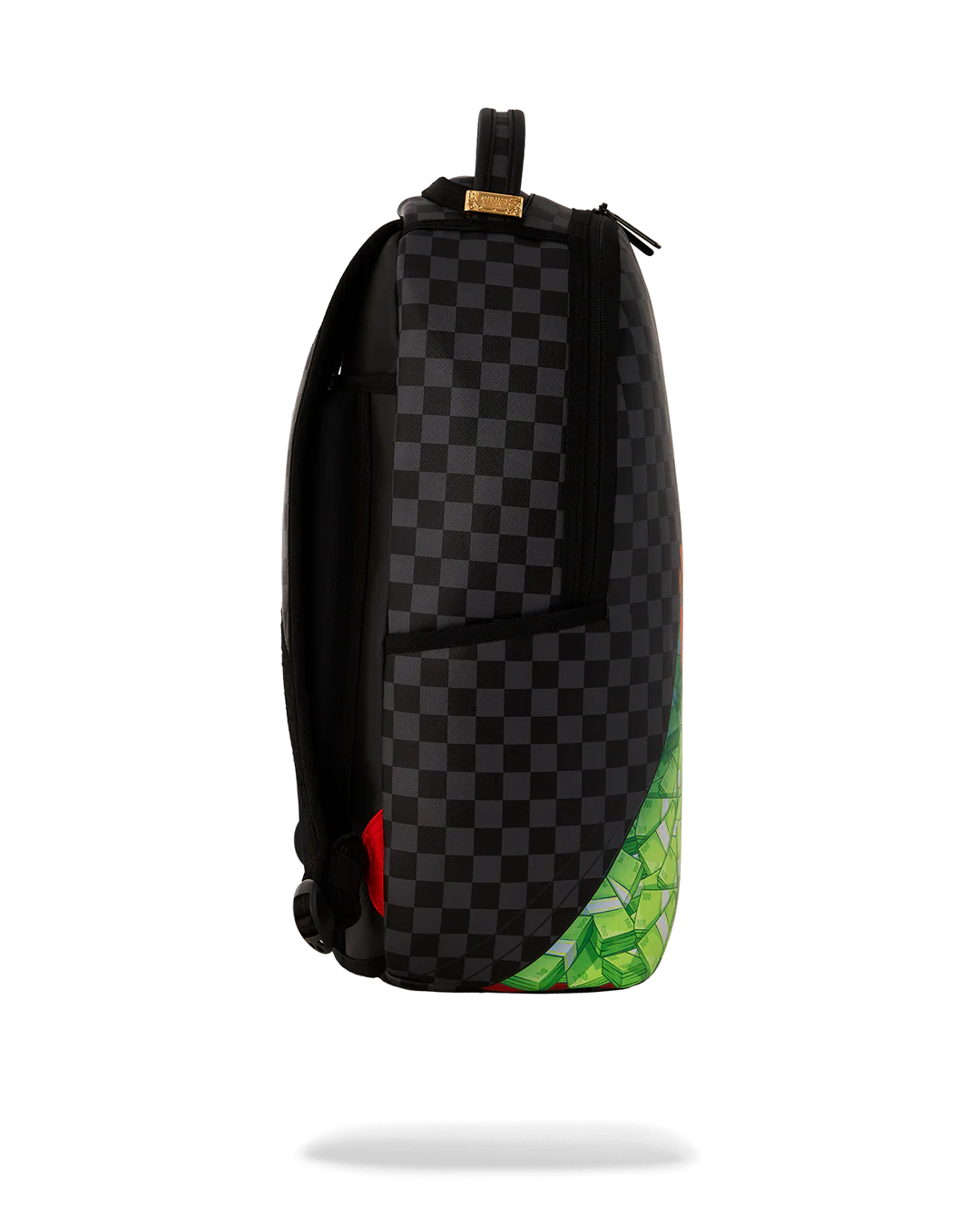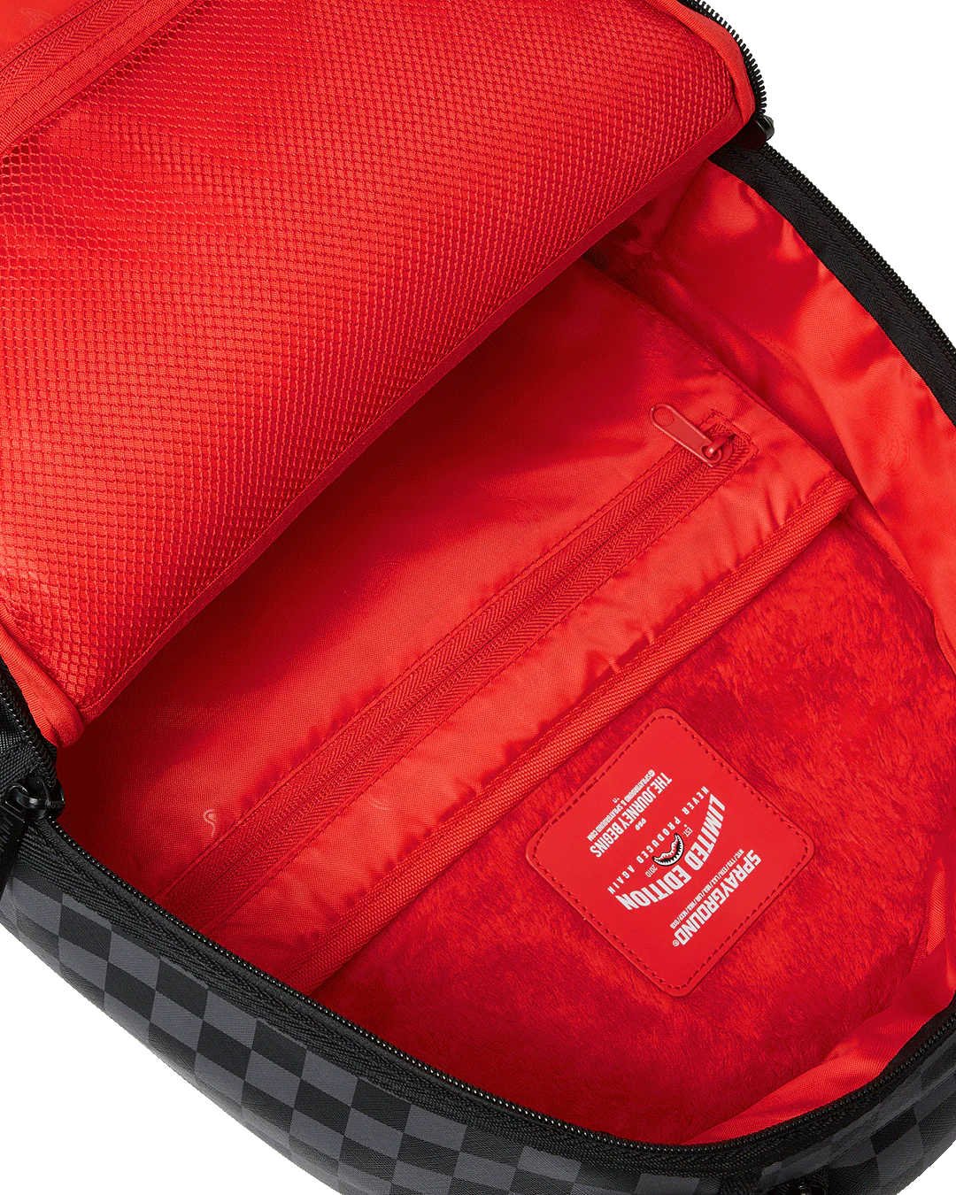 - Dimensions: 18" x 6" x 11.5" • Front zipper pocket • Side pockets • Zippered Stash pocket • Separate velour sunglass compartment • Ergonomic mesh back padding • Adjustable Straps for custom sizing • Gold zippers with metal hardware • Metal "Sprayground Authentic" badge • Slide through back sleeve connects to carry-on luggage to free your hands