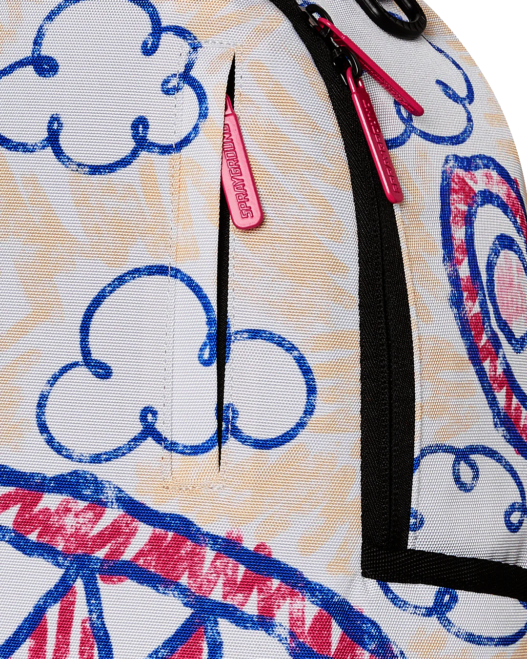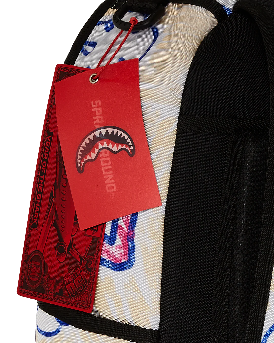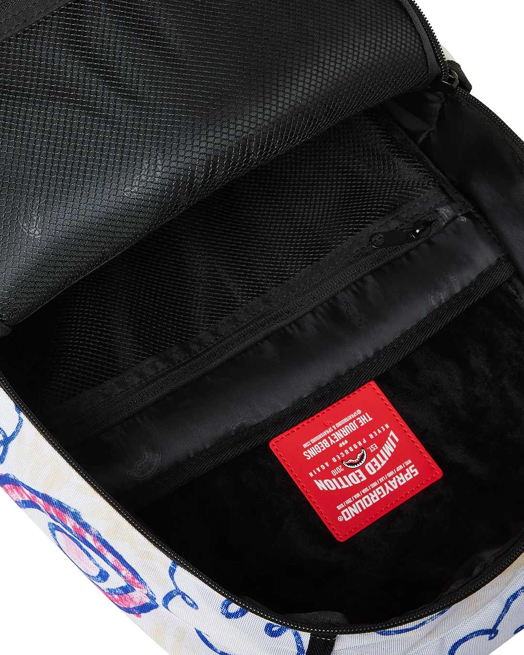 - Dimensions: 18" x 6" x 11.5" • Front zipper pocket • Side pockets • Zippered Stash pocket • Separate velour sunglass compartment • Ergonomic mesh back padding • Adjustable Straps for custom sizing • Gold zippers with metal hardware • Metal "Sprayground Authentic" badge • Slide through back sleeve connects to carry-on luggage to free your hands