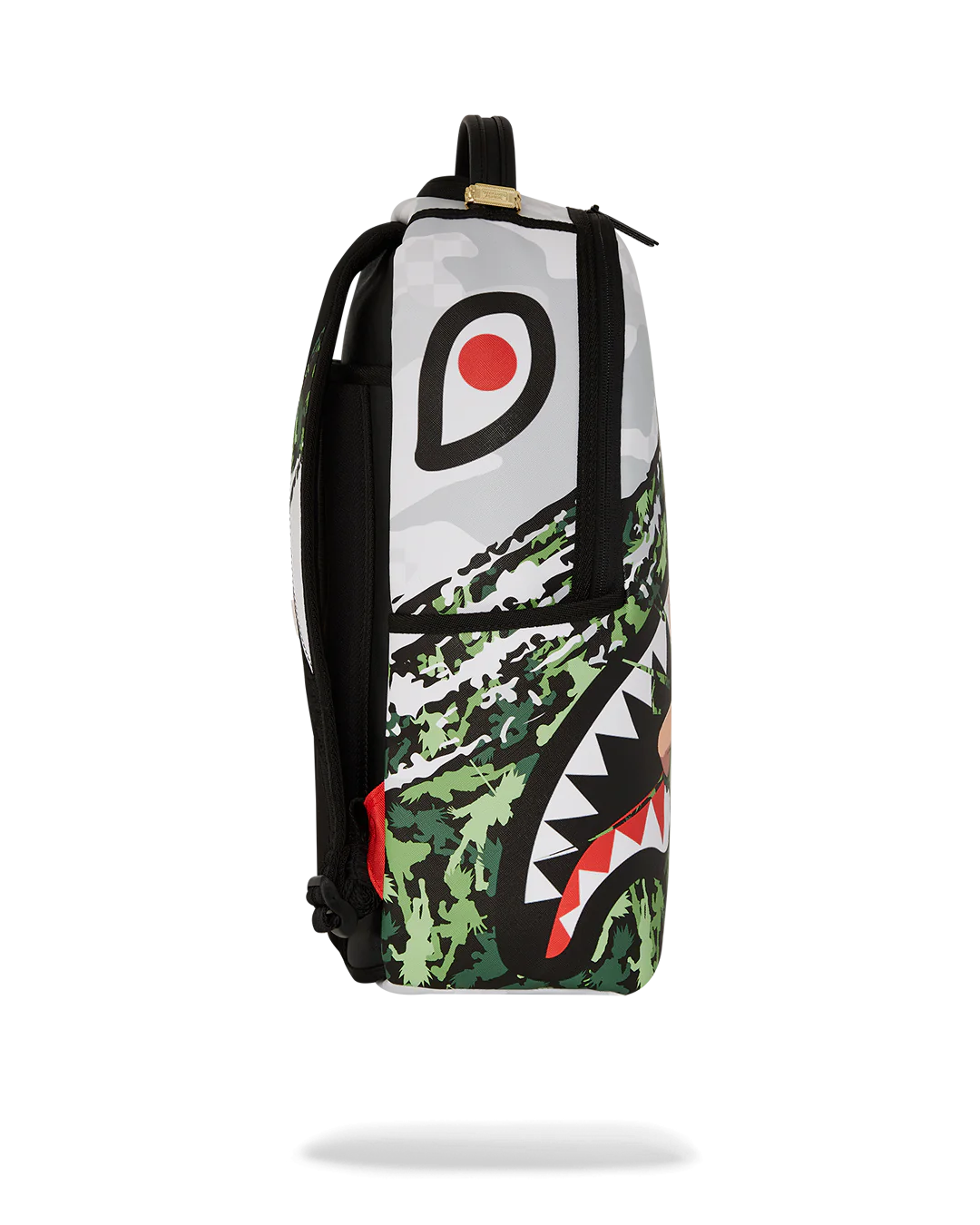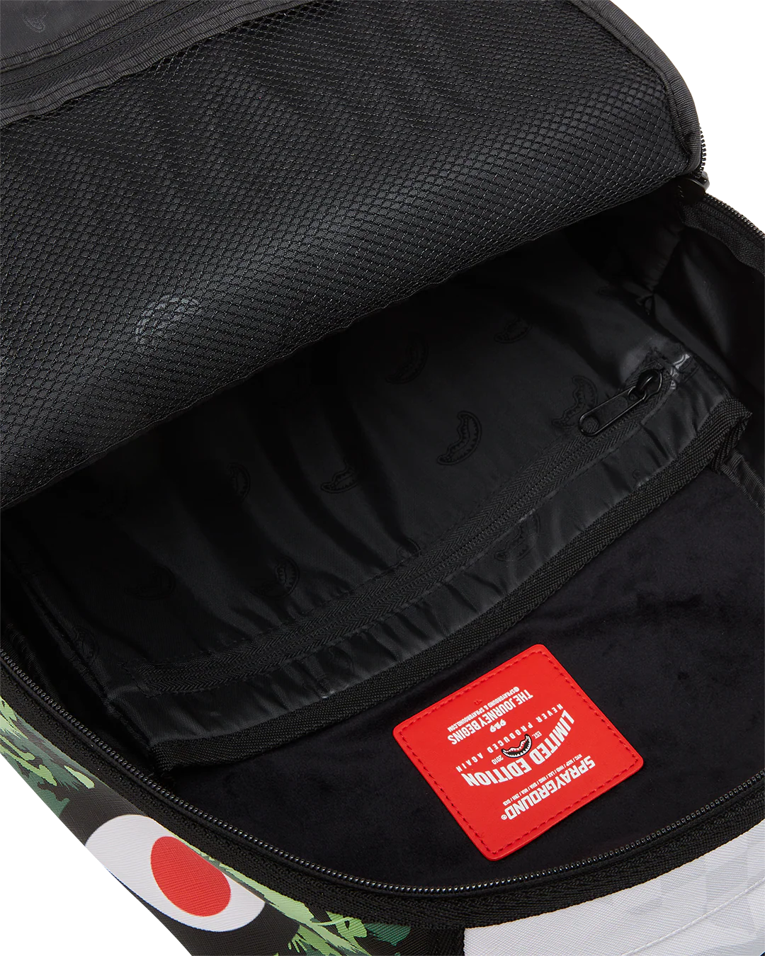 - Dimensions: 18" x 6" x 11.5" • Front zipper pocket • Side pockets • Zippered Stash pocket • Separate velour sunglass compartment • Ergonomic mesh back padding • Adjustable Straps for custom sizing • Gold zippers with metal hardware • Metal "Sprayground Authentic" badge • Slide through back sleeve connects to carry-on luggage to free your hands