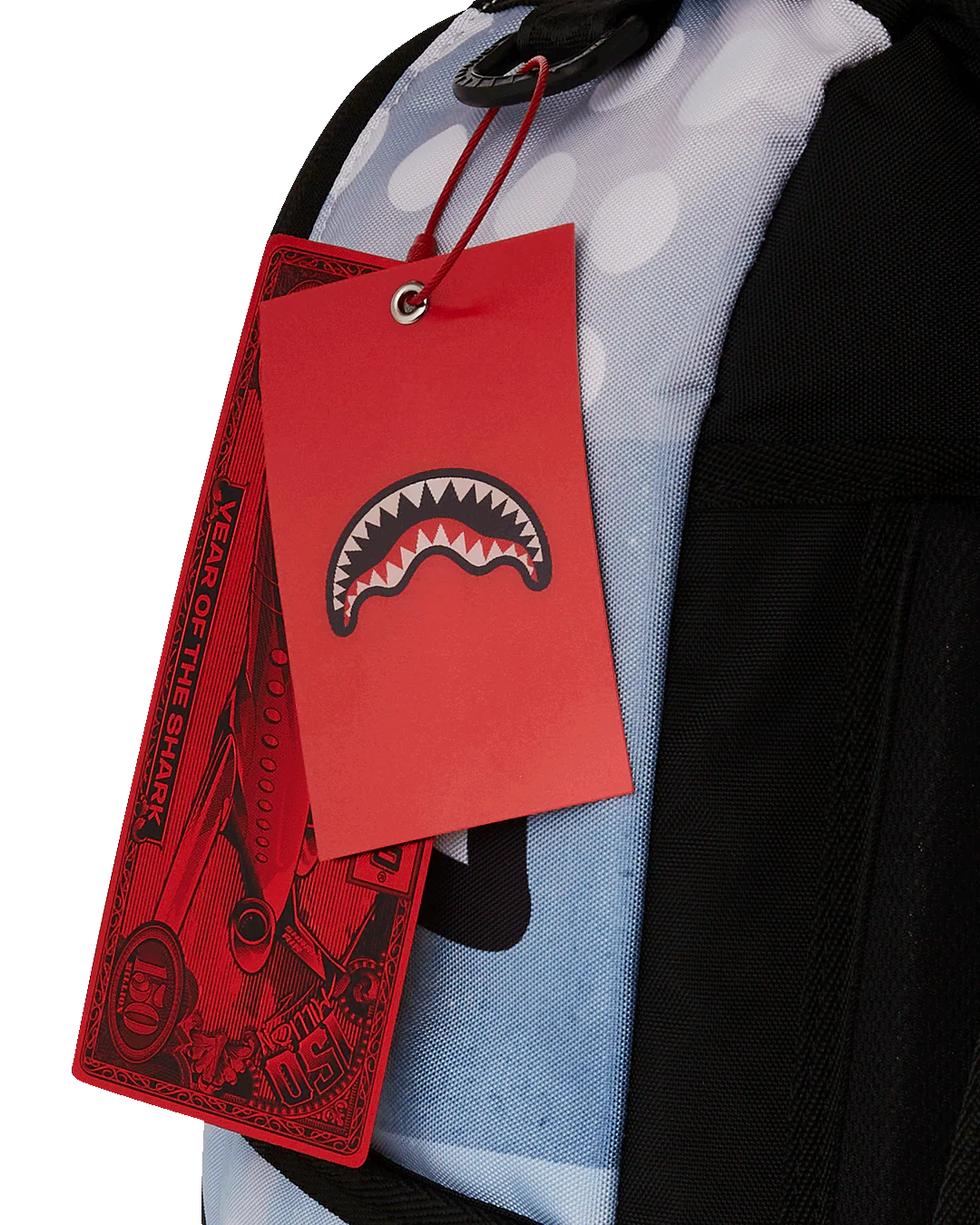 - Dimensions: 18" x 6" x 11.5" • Front zipper pocket • Side pockets • Zippered Stash pocket • Separate velour sunglass compartment • Ergonomic mesh back padding • Adjustable Straps for custom sizing • Gold zippers with metal hardware • Metal "Sprayground Authentic" badge • Slide through back sleeve connects to carry-on luggage to free your hands