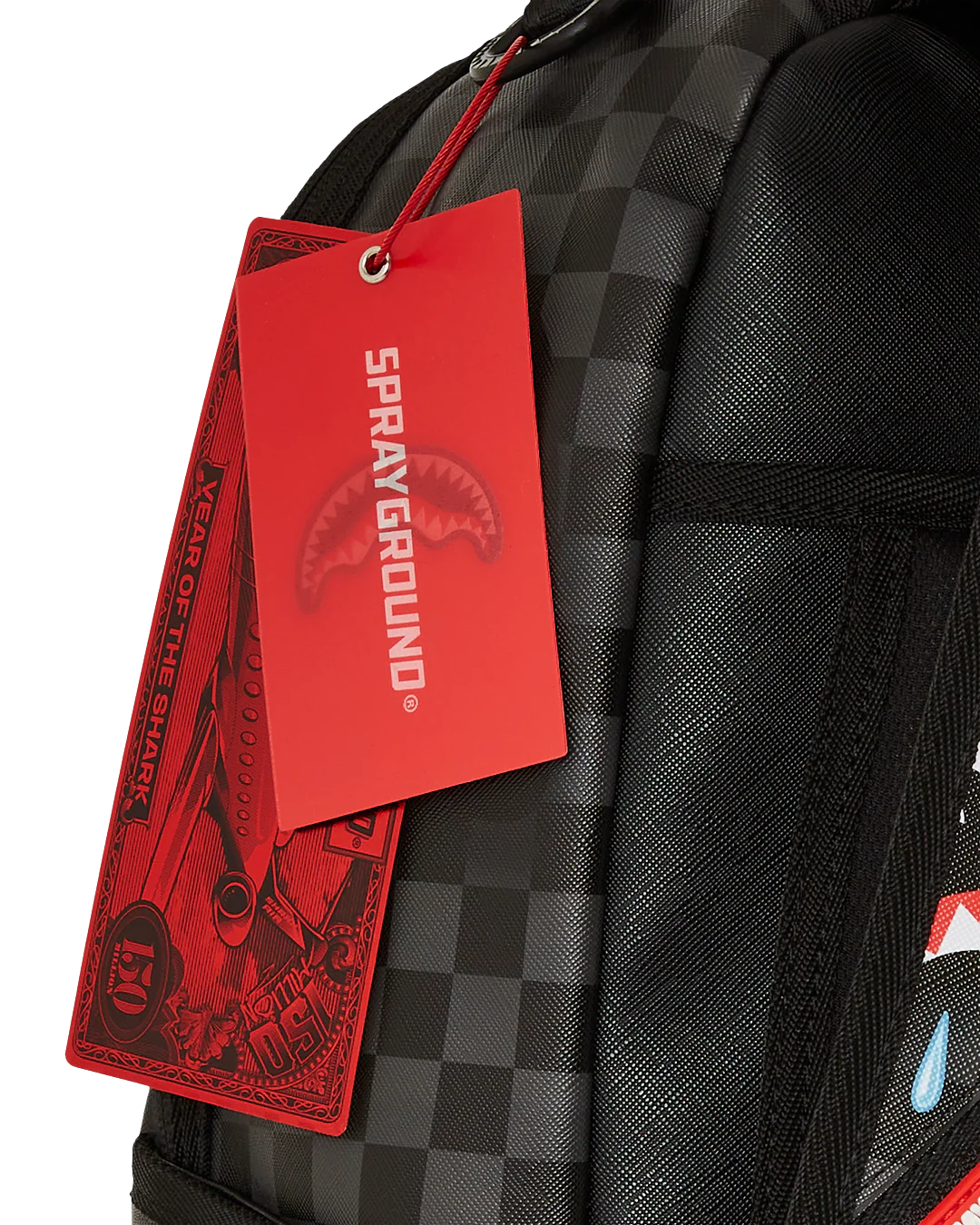 - Dimensions: 18" x 6" x 11.5" • Front zipper pocket • Side pockets • Zippered Stash pocket • Separate velour sunglass compartment • Ergonomic mesh back padding • Adjustable Straps for custom sizing • Gold zippers with metal hardware • Metal "Sprayground Authentic" badge • Slide through back sleeve connects to carry-on luggage to free your hands