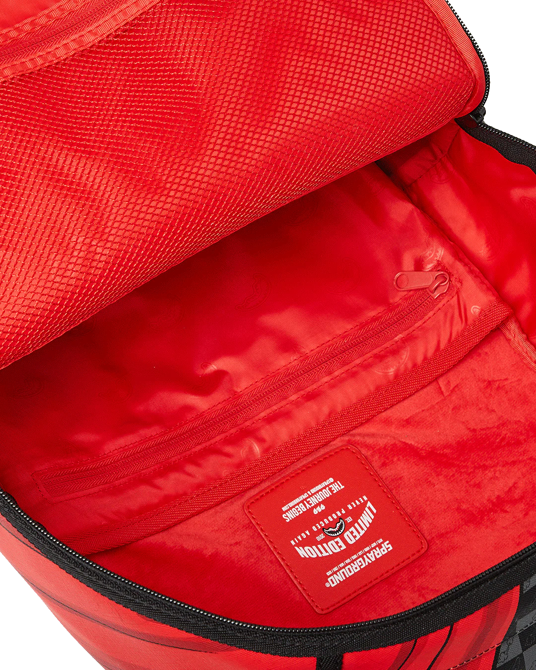 - Dimensions: 18" x 6" x 11.5" • Front zipper pocket • Side pockets • Zippered Stash pocket • Separate velour sunglass compartment • Ergonomic mesh back padding • Adjustable Straps for custom sizing • Gold zippers with metal hardware • Metal "Sprayground Authentic" badge • Slide through back sleeve connects to carry-on luggage to free your hands