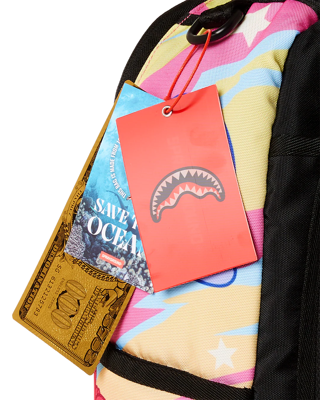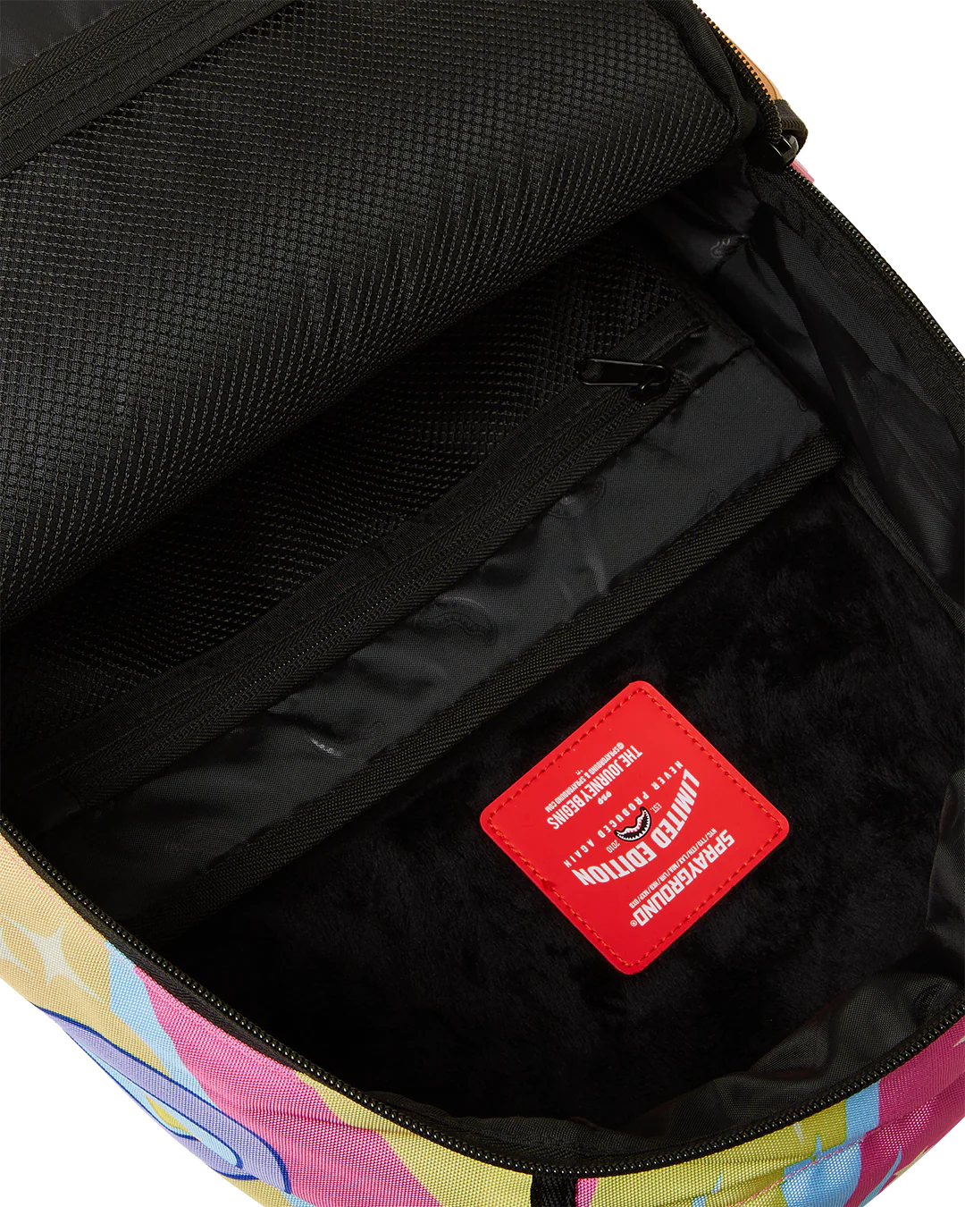 - Dimensions: 18" x 6" x 11.5" • Front zipper pocket • Side pockets • Zippered Stash pocket • Separate velour sunglass compartment • Ergonomic mesh back padding • Adjustable Straps for custom sizing • Gold zippers with metal hardware • Metal "Sprayground Authentic" badge • Slide through back sleeve connects to carry-on luggage to free your hands