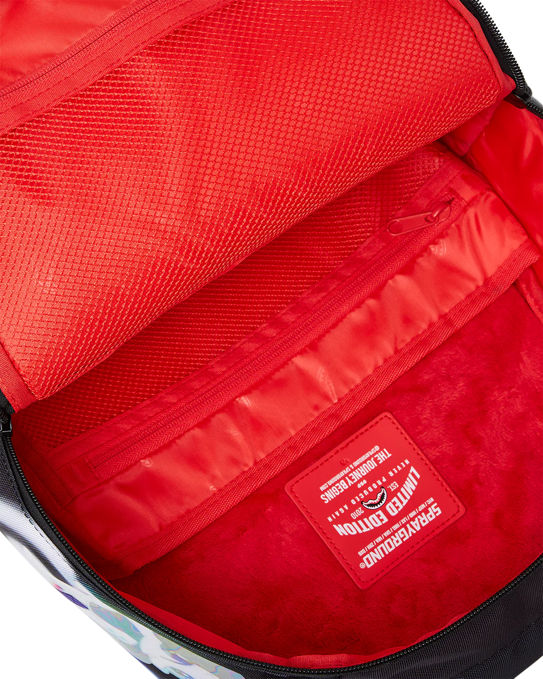 - Dimensions: 18" x 6" x 11.5" • Front zipper pocket • Side pockets • Zippered Stash pocket • Separate velour sunglass compartment • Ergonomic mesh back padding • Adjustable Straps for custom sizing • Gold zippers with metal hardware • Metal "Sprayground Authentic" badge • Slide through back sleeve connects to carry-on luggage to free your hands