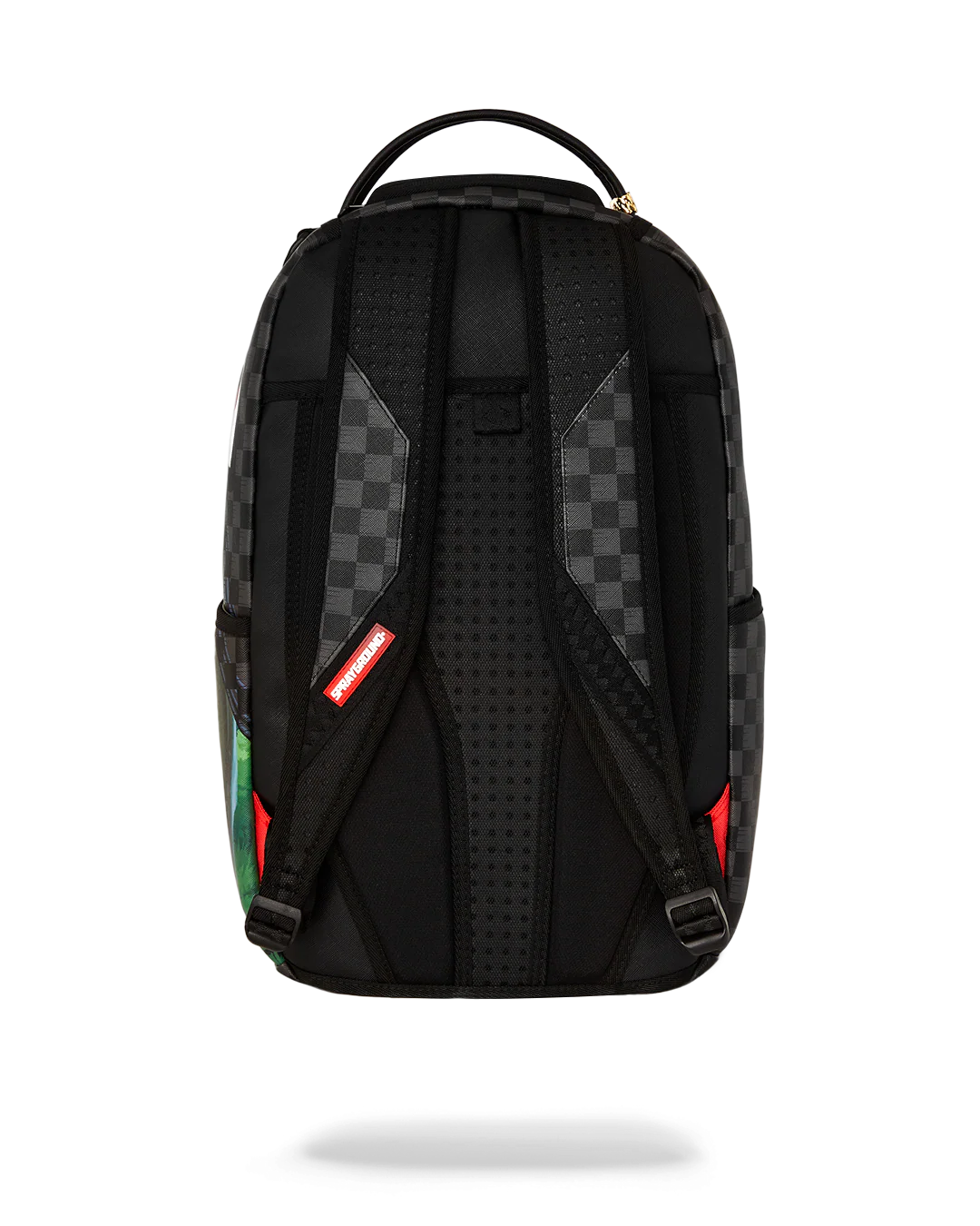 - Dimensions: 18" x 6" x 11.5" • Front zipper pocket • Side pockets • Zippered Stash pocket • Separate velour sunglass compartment • Ergonomic mesh back padding • Adjustable Straps for custom sizing • Gold zippers with metal hardware • Metal "Sprayground Authentic" badge • Slide through back sleeve connects to carry-on luggage to free your hands
