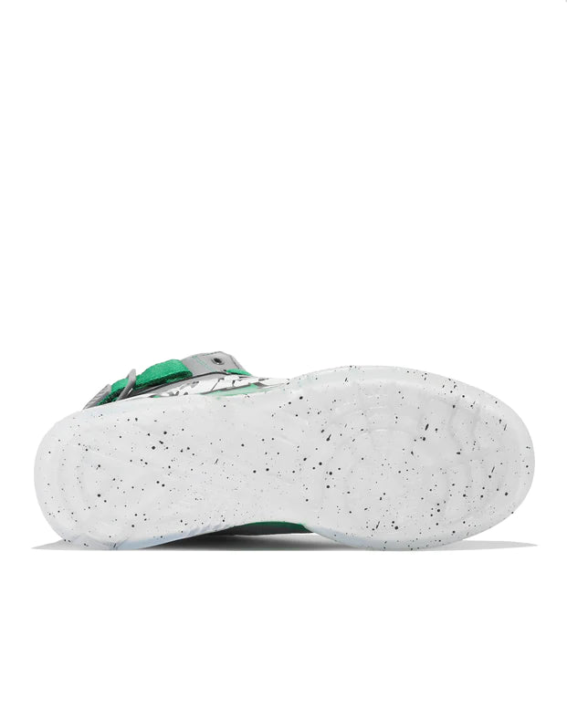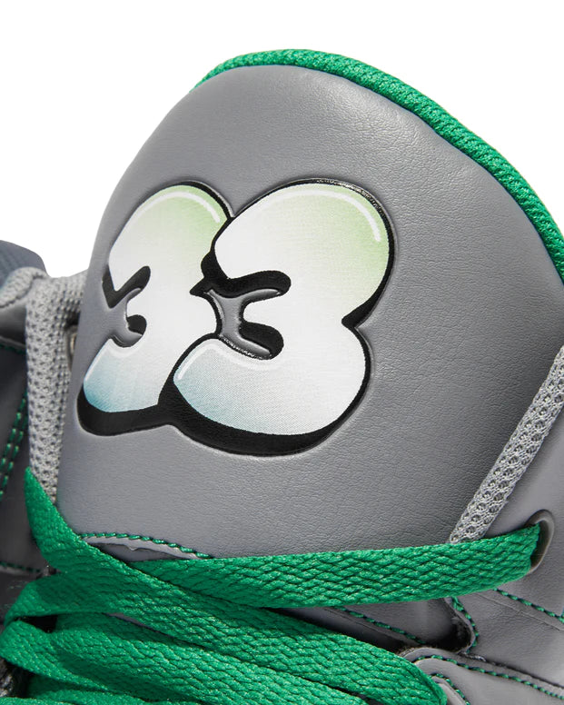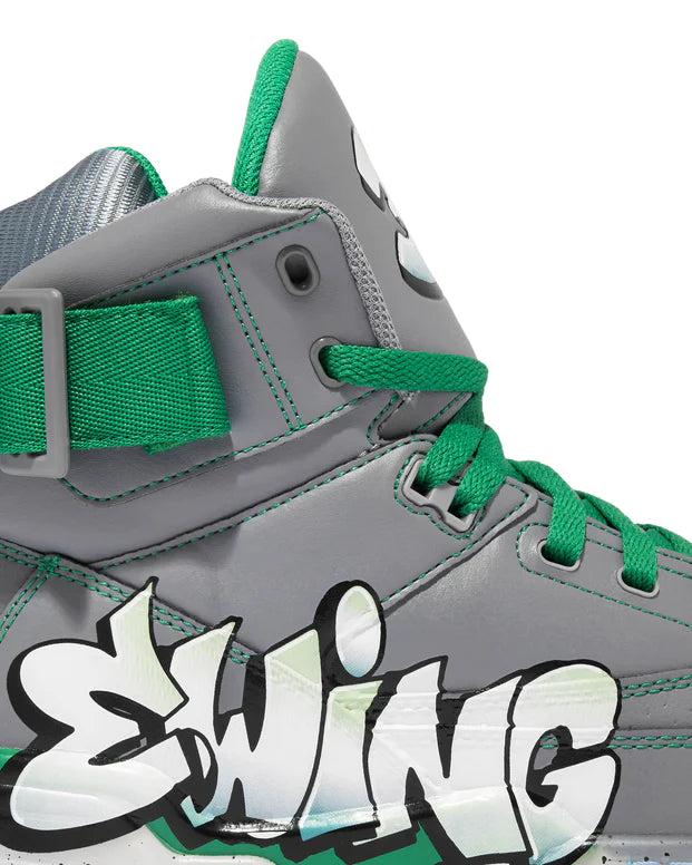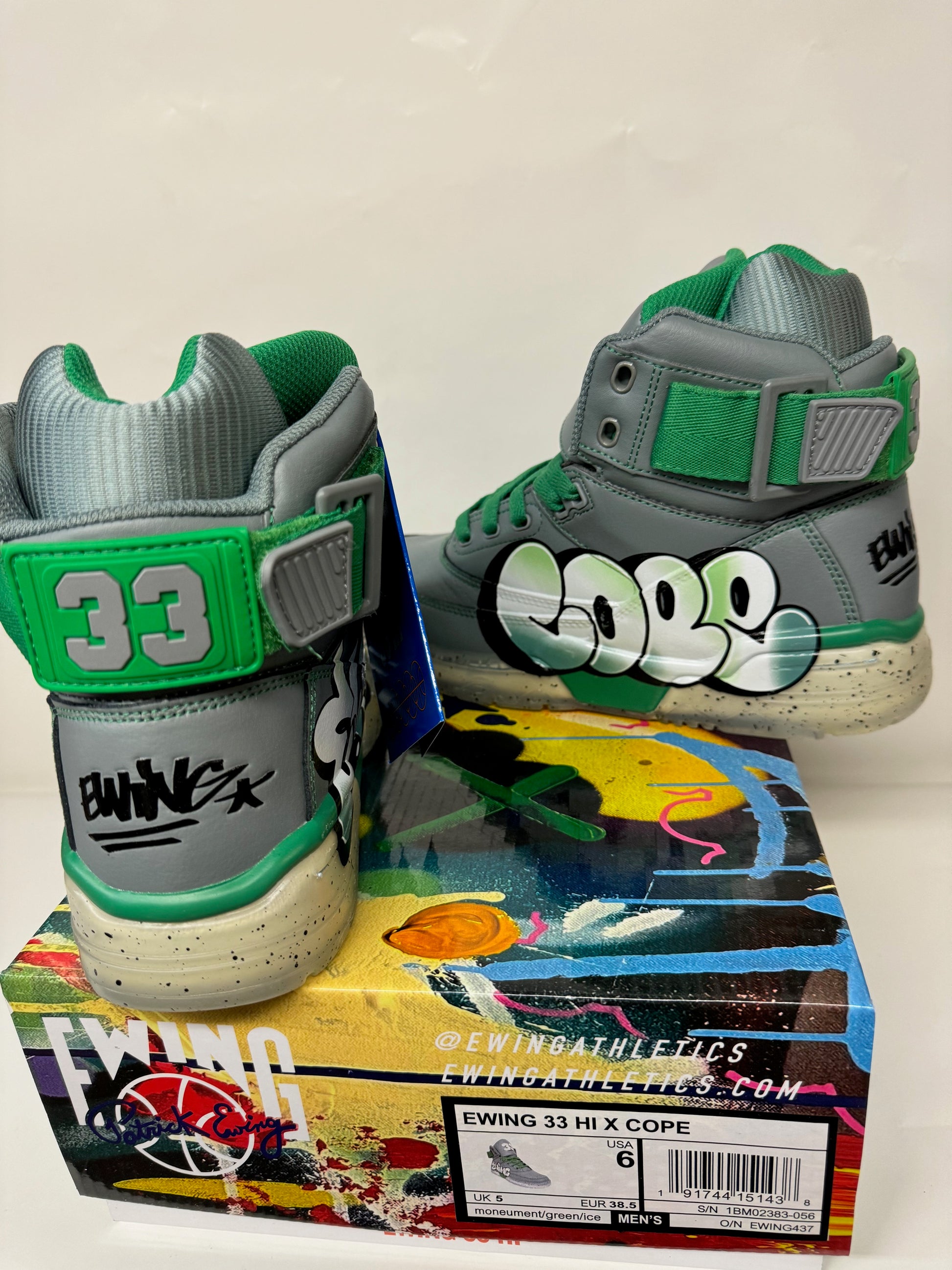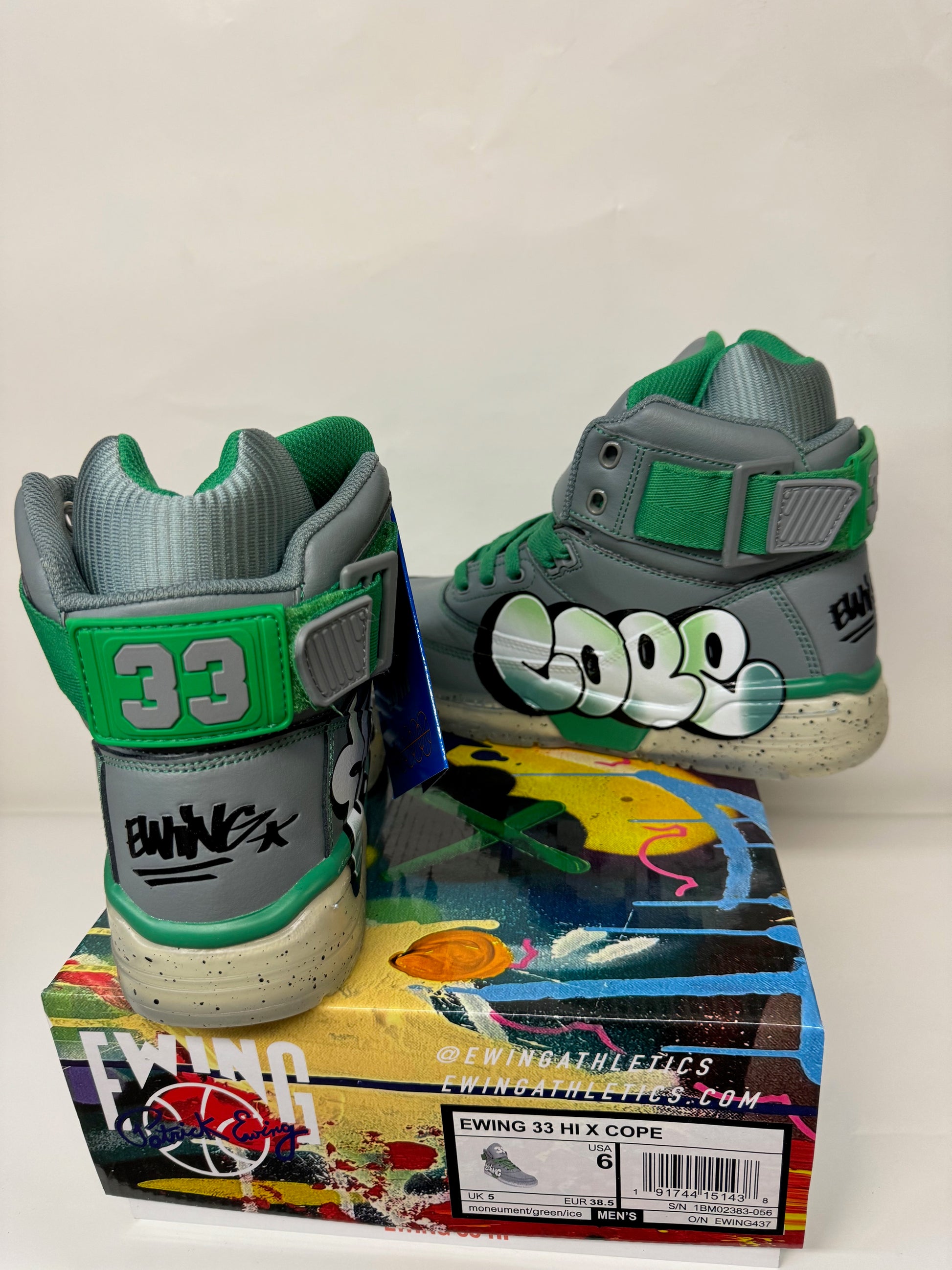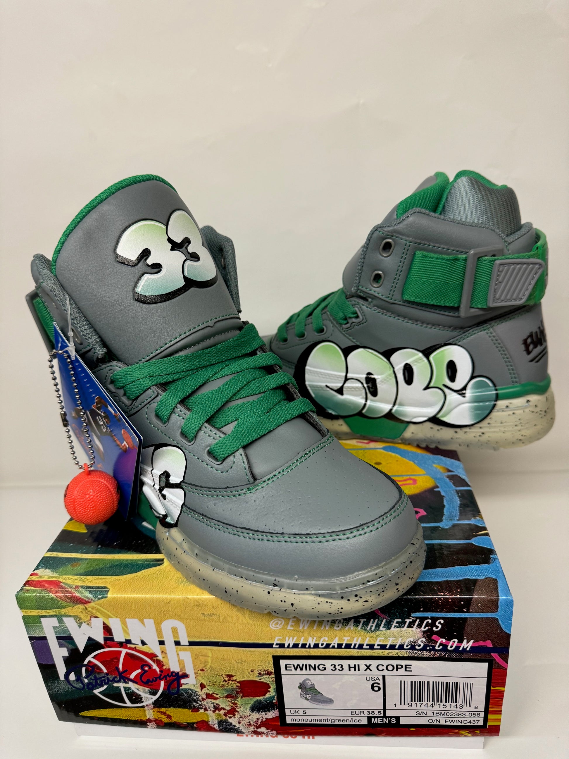 We are thrilled to collaborate with Cope on a unique rendition of our 33 HI — the sneakers feature an all-grey upper as a callback to concrete walls and green accenting to represent the urban jungle that is New York. Featuring the legendary Cope throw up on one shoe and a Ewing throw up on the other, the sneakers also showcase a clear, speckled sole that pays homage to graffiti drips. Lastly, the sneakers come in a special box designed for this collection.