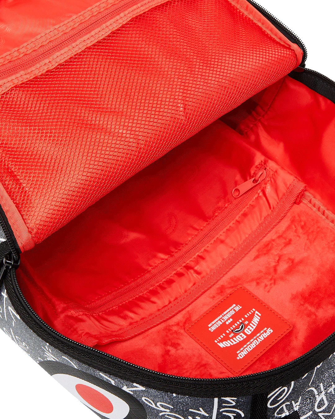 - Dimensions: 18" x 6" x 11.5" • Front zipper pocket • Side pockets • Zippered Stash pocket • Separate velour sunglass compartment • Ergonomic mesh back padding • Adjustable Straps for custom sizing • Gold zippers with metal hardware • Metal "Sprayground Authentic" badge • Slide through back sleeve connects to carry-on luggage to free your hands