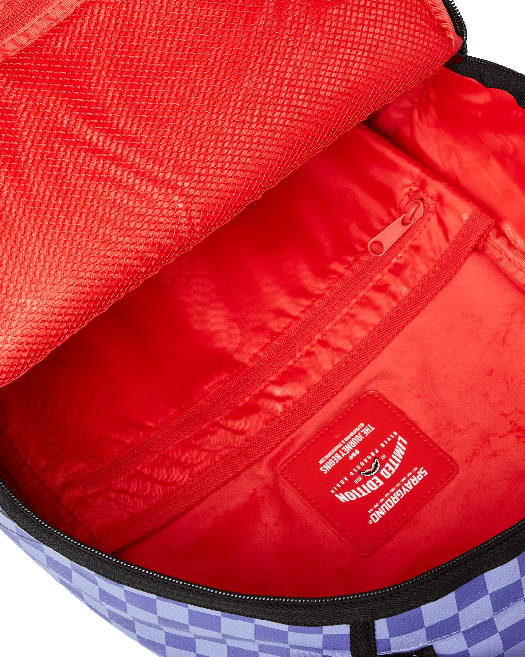 - Dimensions: 18" x 6" x 11.5" • Front zipper pocket • Side pockets • Zippered Stash pocket • Separate velour sunglass compartment • Ergonomic mesh back padding • Adjustable Straps for custom sizing • Gold zippers with metal hardware • Metal "Sprayground Authentic" badge • Slide through back sleeve connects to carry-on luggage to free your hands
