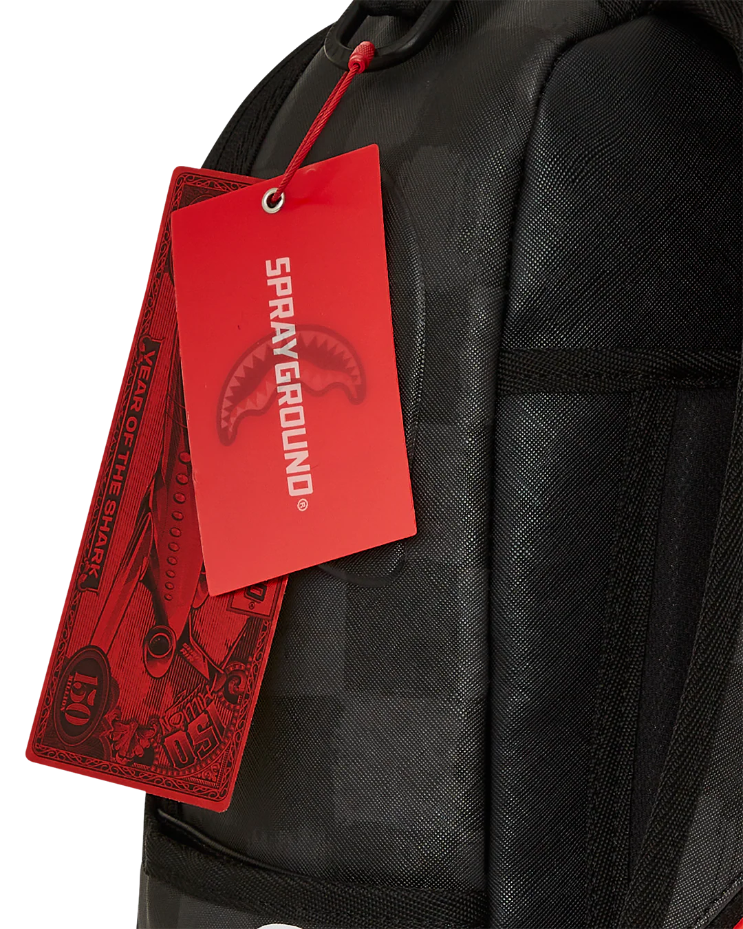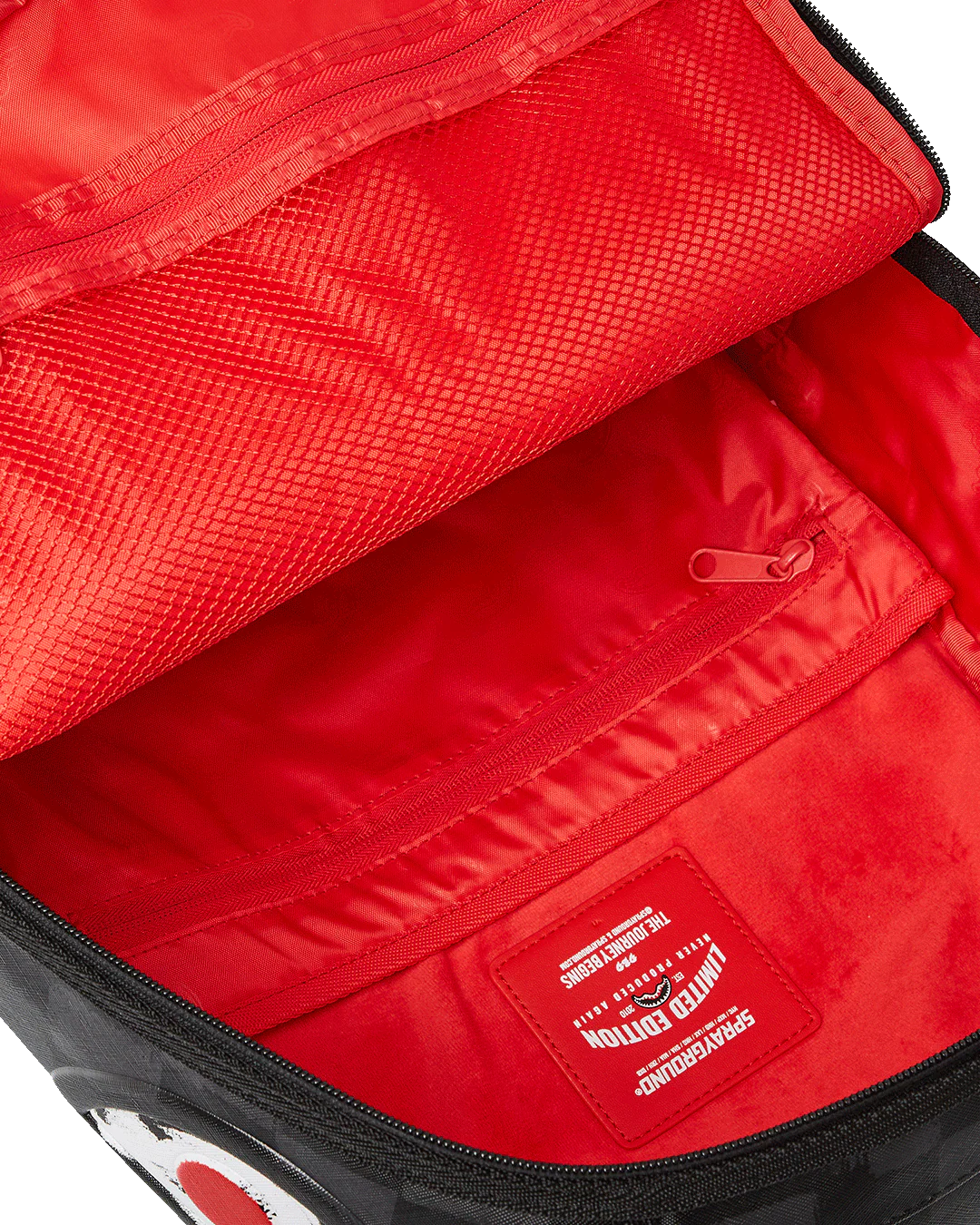 - Dimensions: 18" x 6" x 11.5" • Front zipper pocket • Side pockets • Zippered Stash pocket • Separate velour sunglass compartment • Ergonomic mesh back padding • Adjustable Straps for custom sizing • Gold zippers with metal hardware • Metal "Sprayground Authentic" badge • Slide through back sleeve connects to carry-on luggage to free your hands