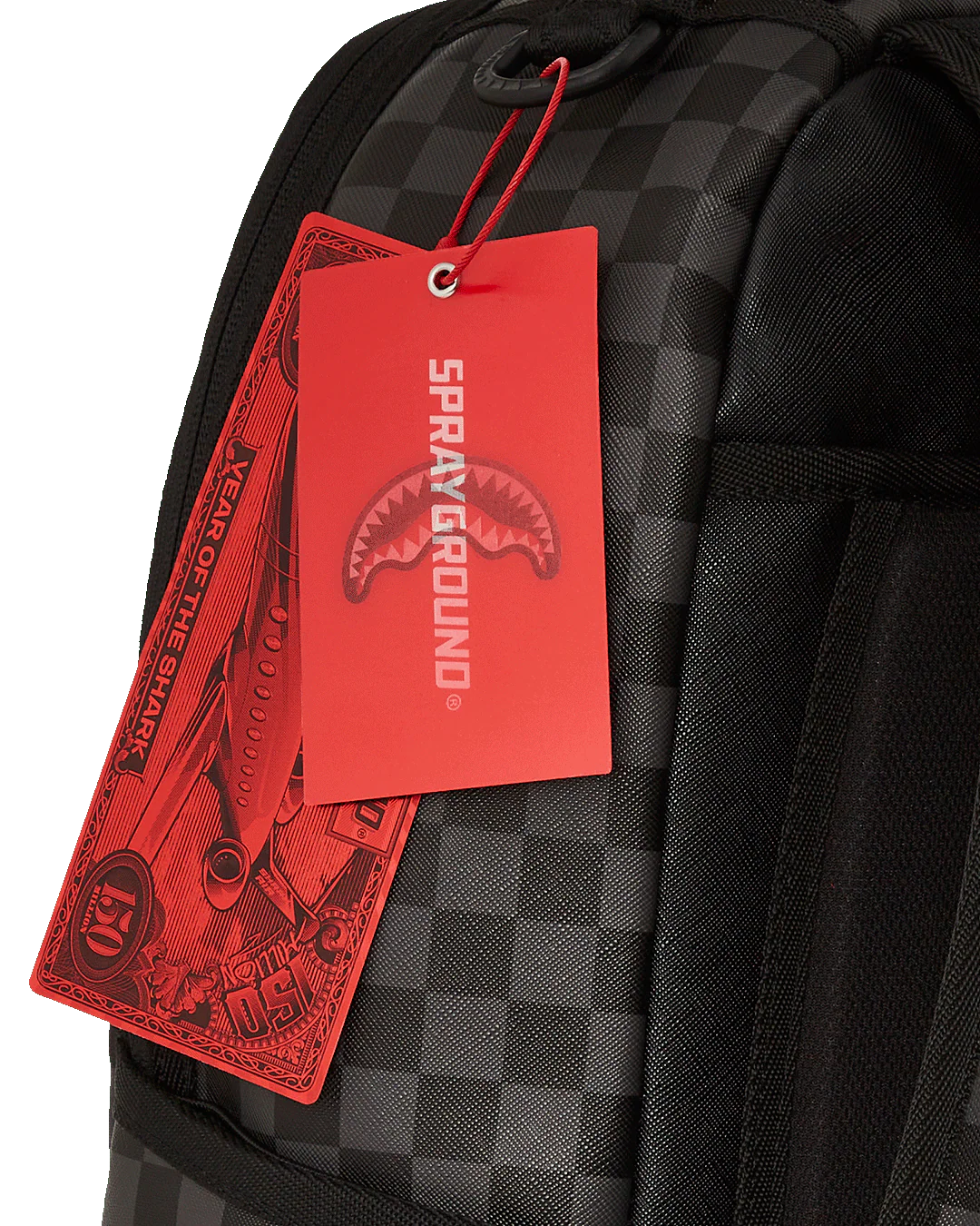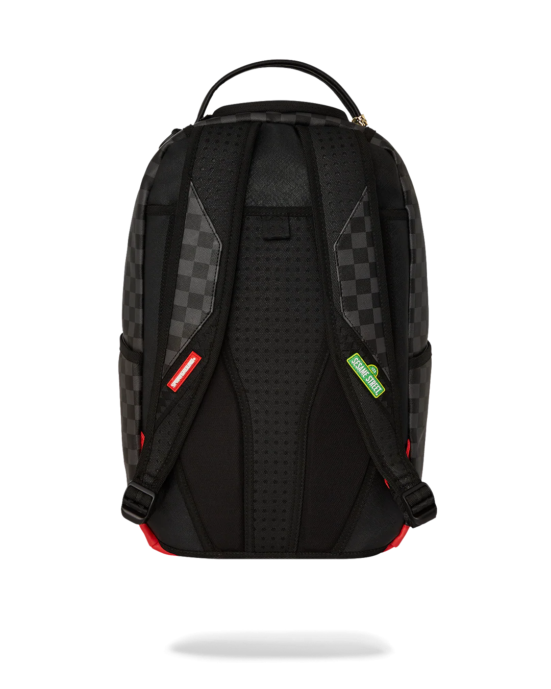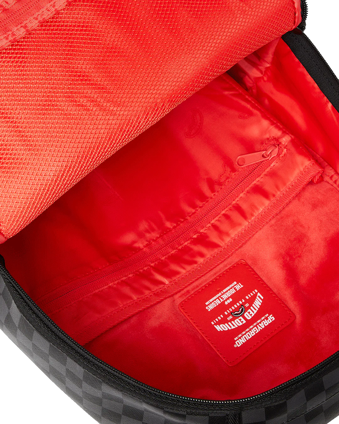 - Dimensions: 18" x 6" x 11.5" • Front zipper pocket • Side pockets • Zippered Stash pocket • Separate velour sunglass compartment • Ergonomic mesh back padding • Adjustable Straps for custom sizing • Gold zippers with metal hardware • Metal "Sprayground Authentic" badge • Slide through back sleeve connects to carry-on luggage to free your hands