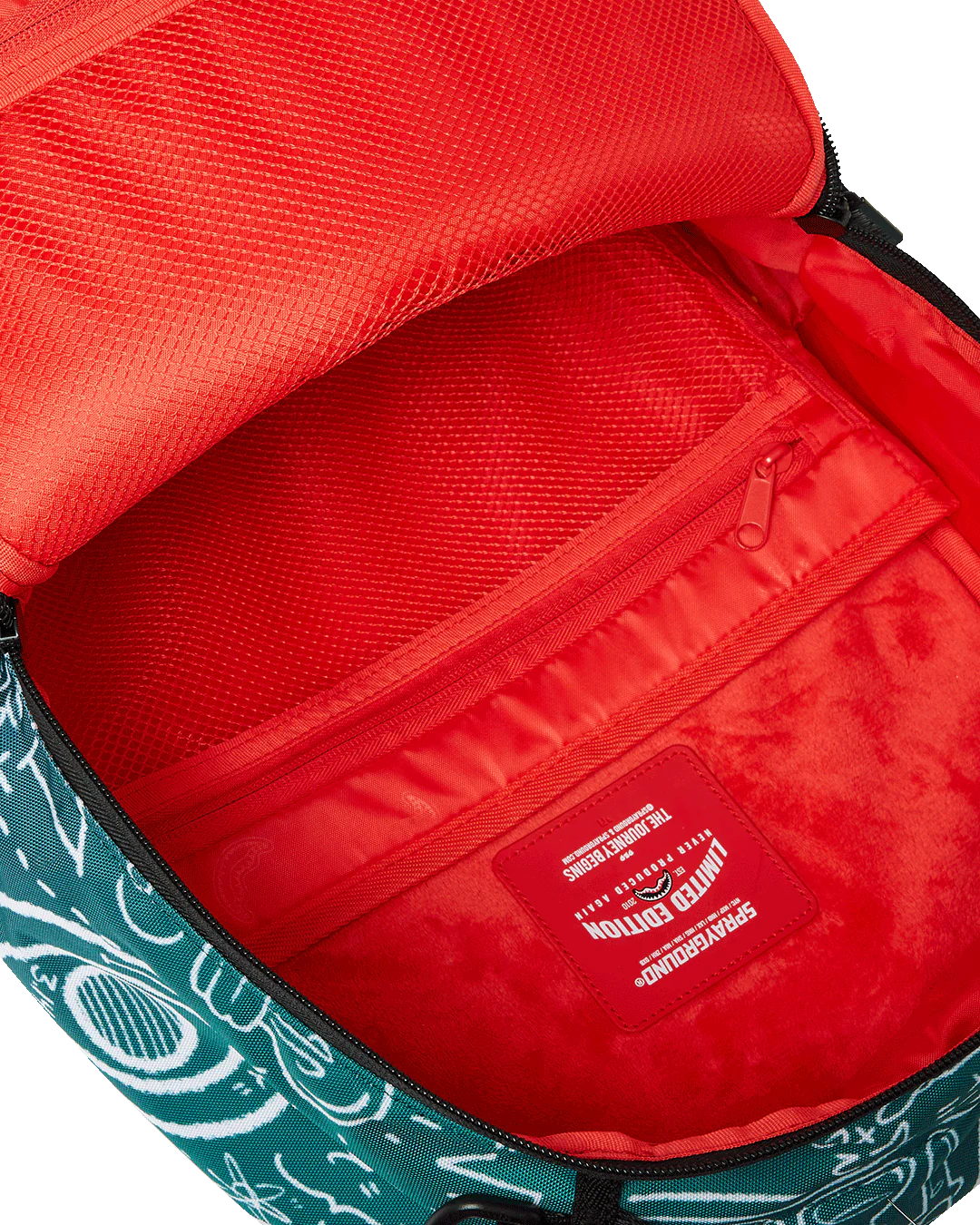 - Dimensions: 18" x 6" x 11.5" • Front zipper pocket • Side pockets • Zippered Stash pocket • Separate velour sunglass compartment • Ergonomic mesh back padding • Adjustable Straps for custom sizing • Gold zippers with metal hardware • Metal "Sprayground Authentic" badge • Slide through back sleeve connects to carry-on luggage to free your hands