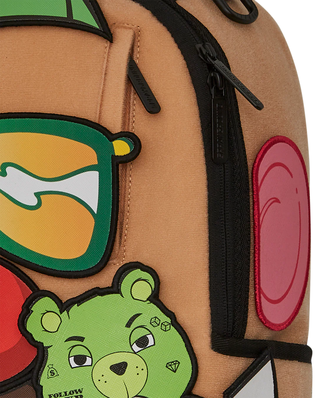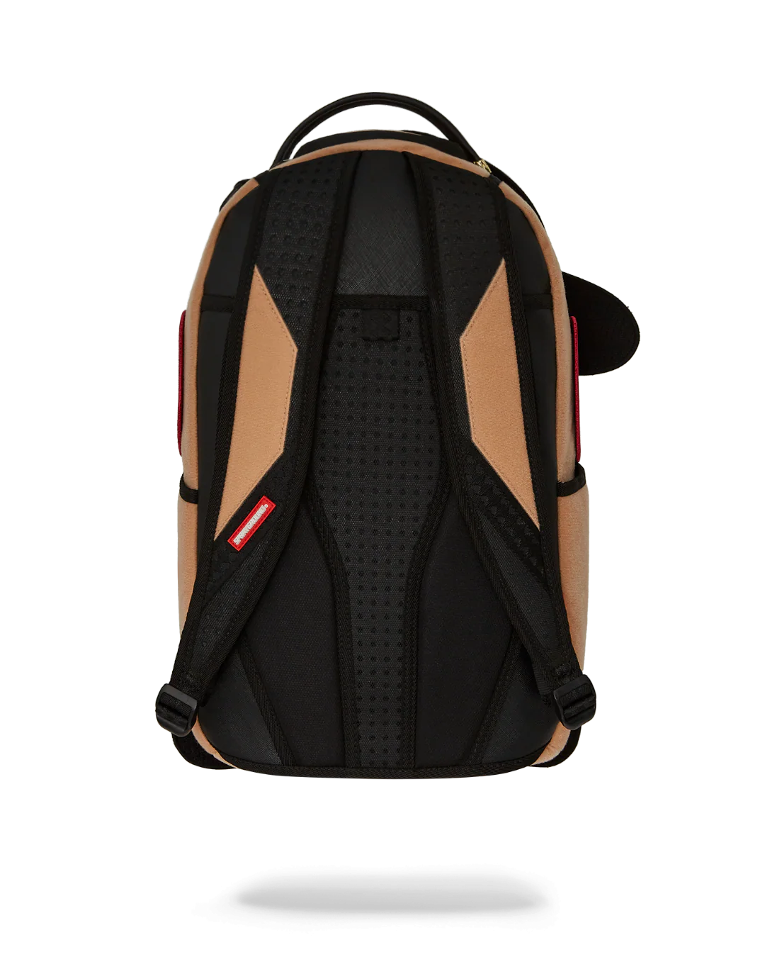 - Dimensions: 18" x 6" x 11.5" • Front zipper pocket • Side pockets • Zippered Stash pocket • Separate velour sunglass compartment • Ergonomic mesh back padding • Adjustable Straps for custom sizing • Gold zippers with metal hardware • Metal "Sprayground Authentic" badge • Slide through back sleeve connects to carry-on luggage to free your hands