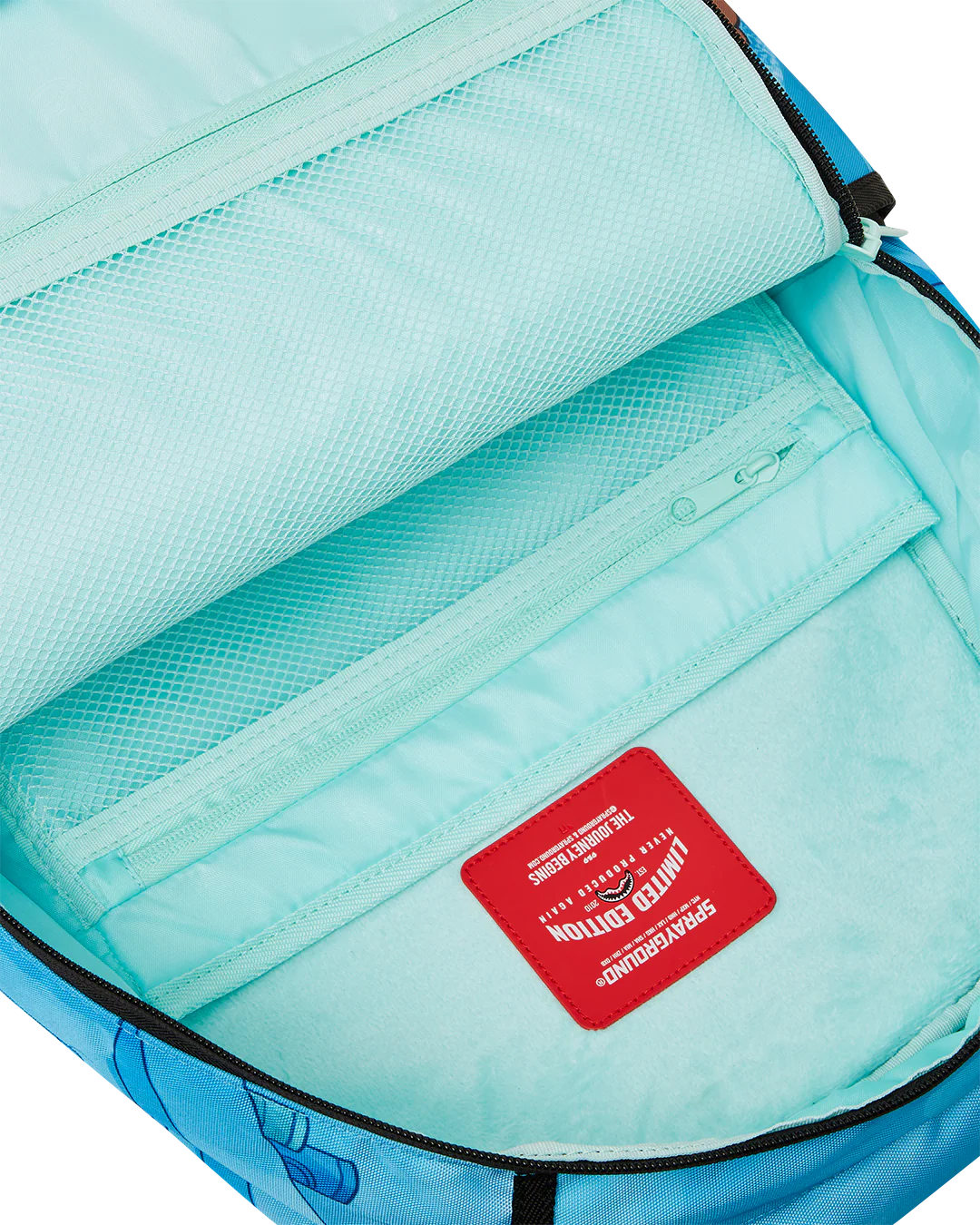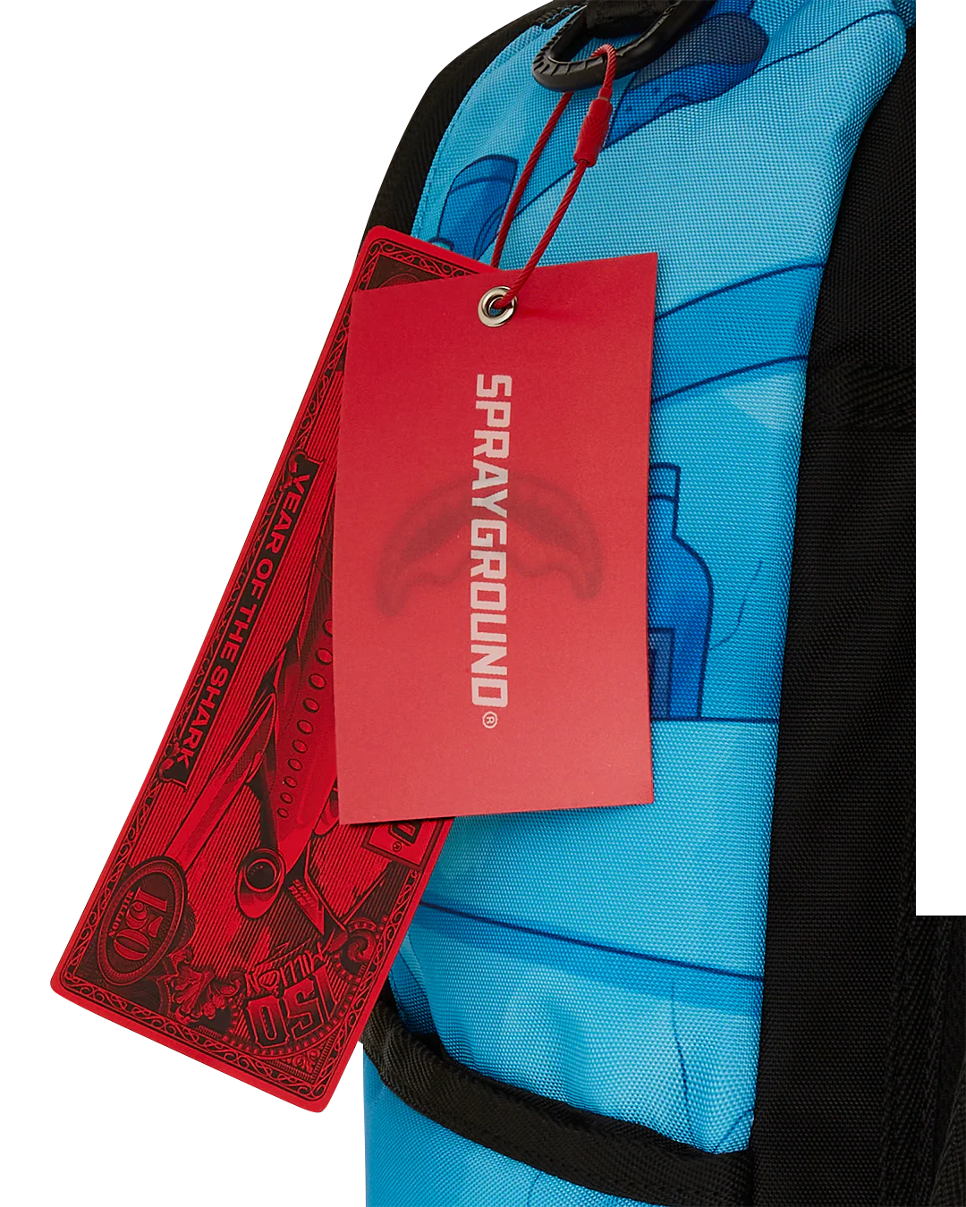 - Dimensions: 18" x 6" x 11.5" • Front zipper pocket • Side pockets • Zippered Stash pocket • Separate velour sunglass compartment • Ergonomic mesh back padding • Adjustable Straps for custom sizing • Gold zippers with metal hardware • Metal "Sprayground Authentic" badge • Slide through back sleeve connects to carry-on luggage to free your hands