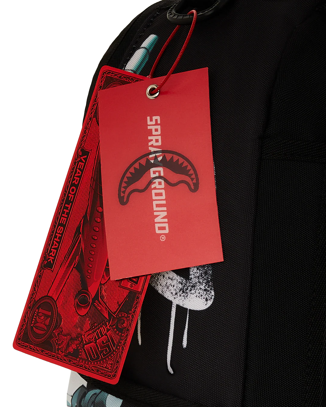 - Dimensions: 18" x 6" x 11.5" • Front zipper pocket • Side pockets • Zippered Stash pocket • Separate velour sunglass compartment • Ergonomic mesh back padding • Adjustable Straps for custom sizing • Gold zippers with metal hardware • Metal "Sprayground Authentic" badge • Slide through back sleeve connects to carry-on luggage to free your hands